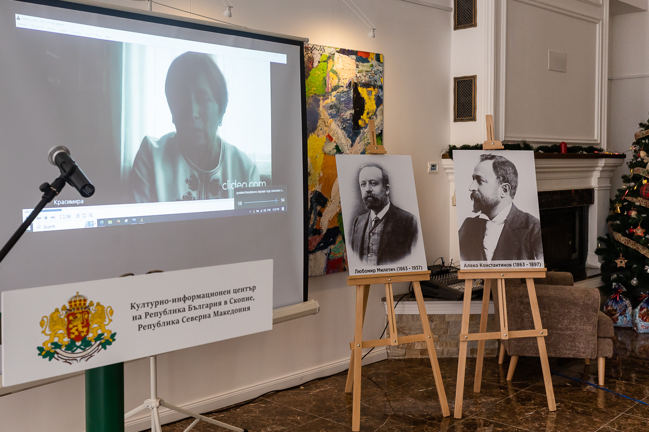 С онлайн презентация, технически осигурено от БКИЦ-Скопие, посветена на моменти от биографията и творчеството на Алеко Константинов участва доц. Мариета Иванова-Гергинова – научен сътрудник в Института за литература при БАН, литературовед, специалист по история на новата българска литература и драматургия. Г-н Владимир Перев – общественик, журналист и изявен пазител на българщината в РСМ, говори за Пейо Яворов и неговата съдба в контекста на любовите му както към жените, така и преди всичко към Македония.