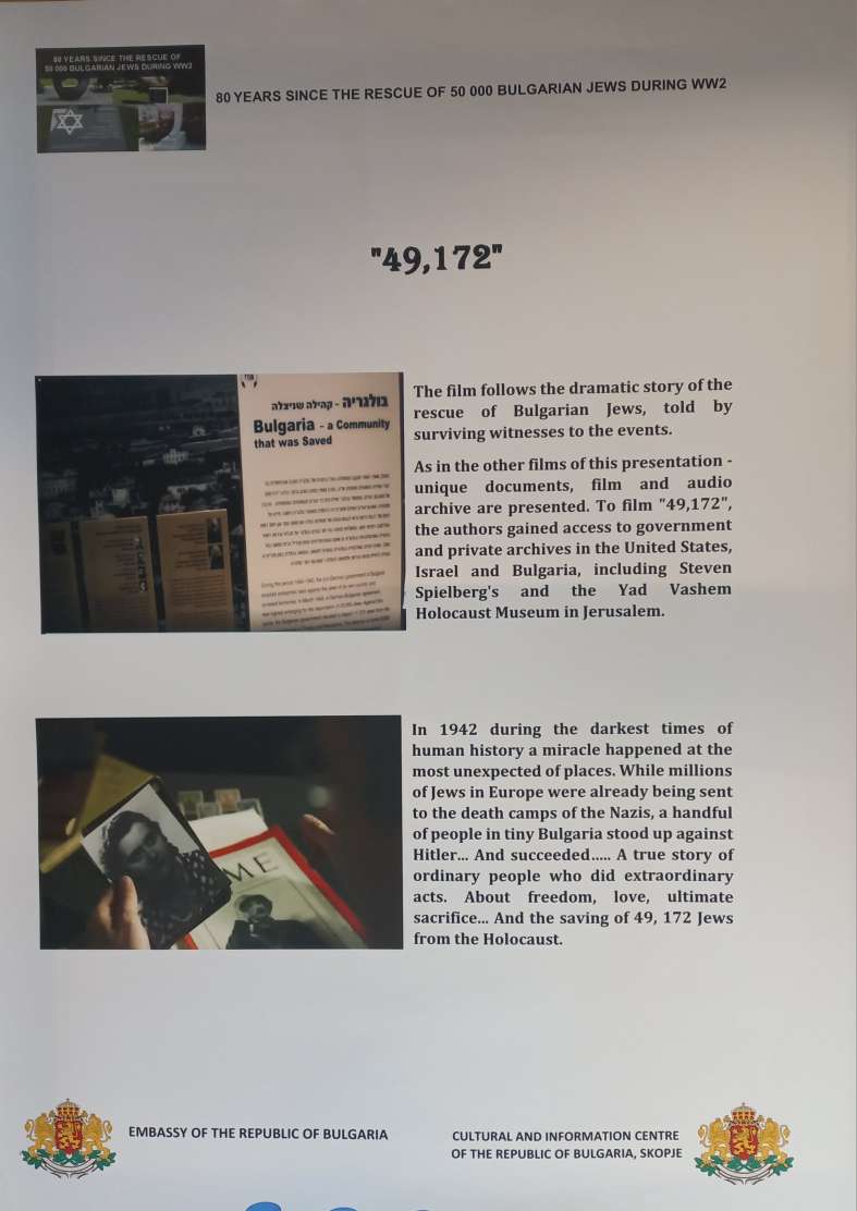 На 18 април 2023 г. в сградата на Делегацията на Европейския съюз в Скопие бе представена прожекция на филма „49 172“ по повод  80 години от спасяването на българските евреи. Прожекцията се организира от Посолството на България в РСМ и Културно-информационния център на Република България в Скопие.